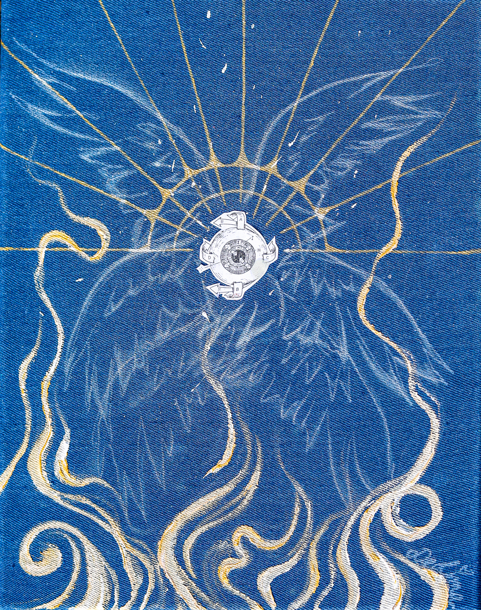 acrylic, spray paint on stretched denim